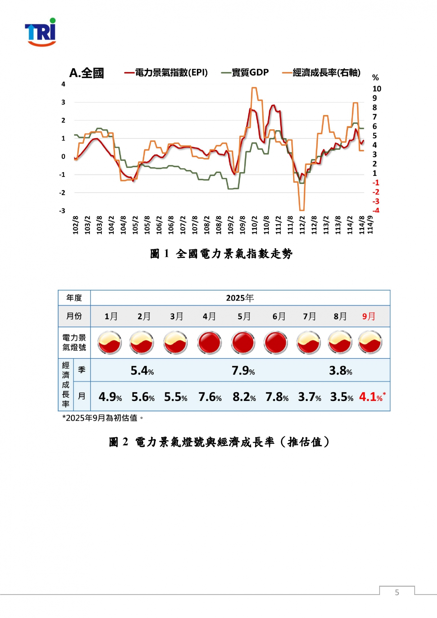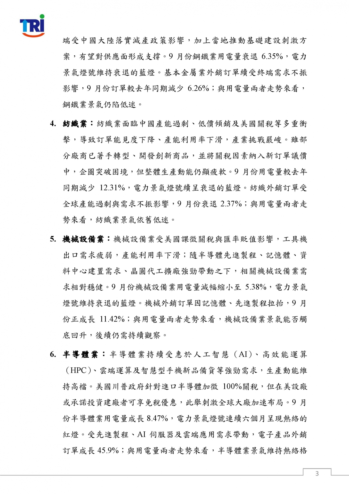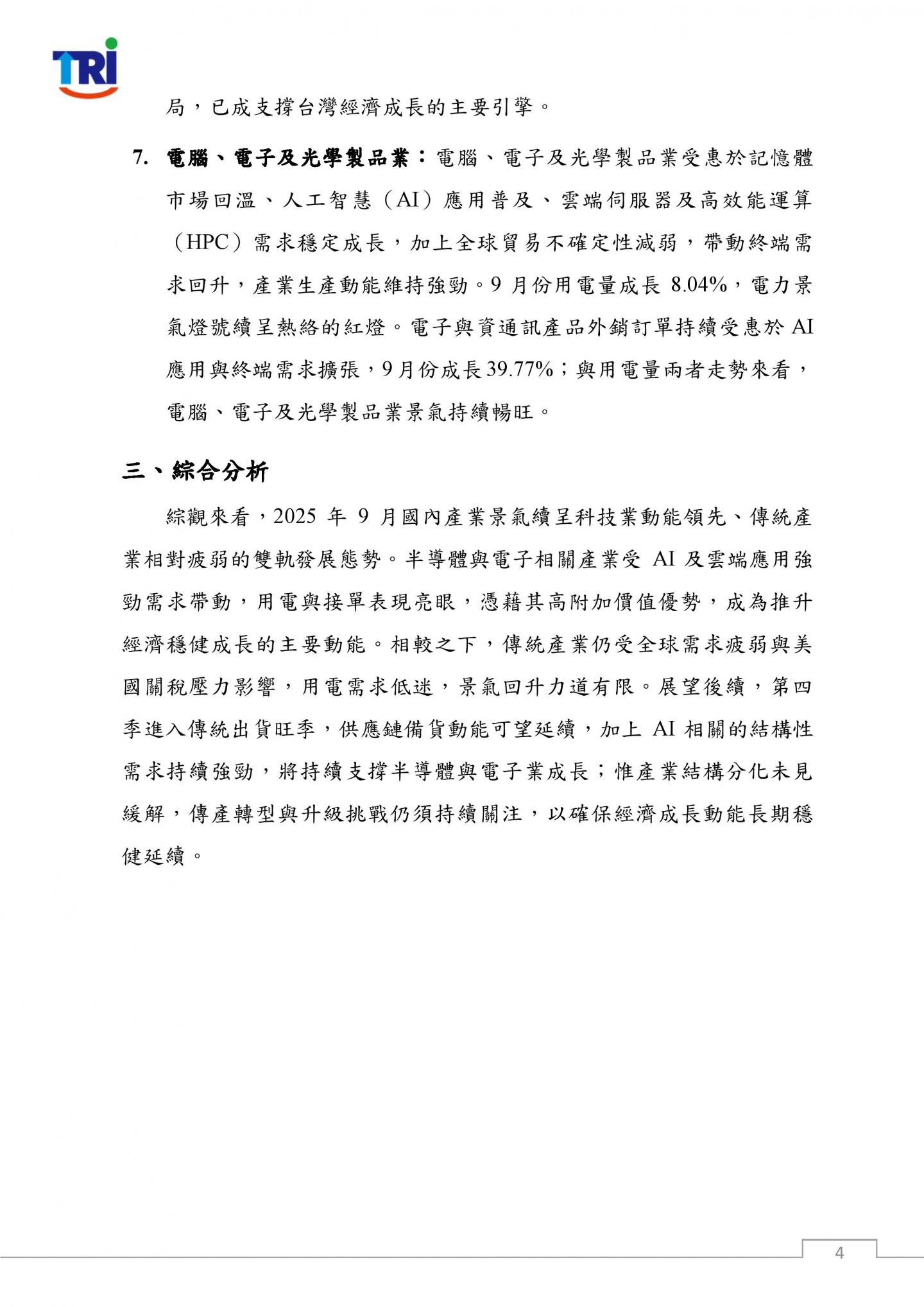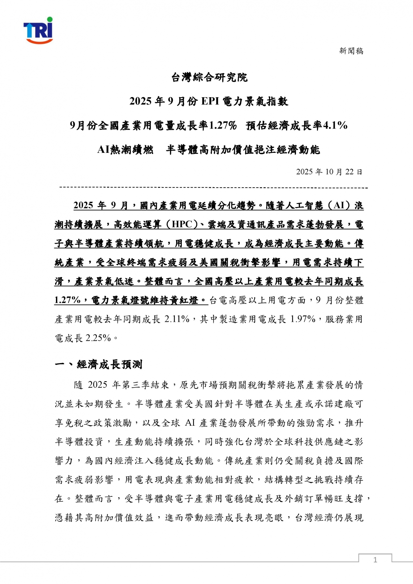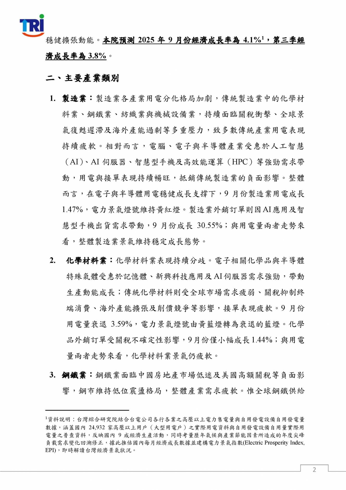 隨2025年第三季結束,原先市場預期關稅衝擊將拖累產業發展的情況並未如期發生。半導體產業受美國針對半導體在美生產或承諾建廠可享免稅之政策激勵,以及全球AI產業蓬勃發展所帶動的強勁需求,推升半導體投資,生產動能持續擴張,同時強化台灣於全球科技供應鏈之影響力,為國內經濟注入穩健成長動能。傳統產業則仍受關稅負擔及國際需求疲弱影響,用電表現與產業動能相對疲軟,結構轉型之挑戰持續存在。整體而言,受半導體與電子產業用電穩健成長及外銷訂單暢旺支撐,憑藉其高附加價值效益,進而帶動經濟成長表現亮眼,台灣經濟仍展現穩健擴張動能。本院預測2025年9月份經濟成長率為 4.1%,第三季經濟成長率為3.8%。