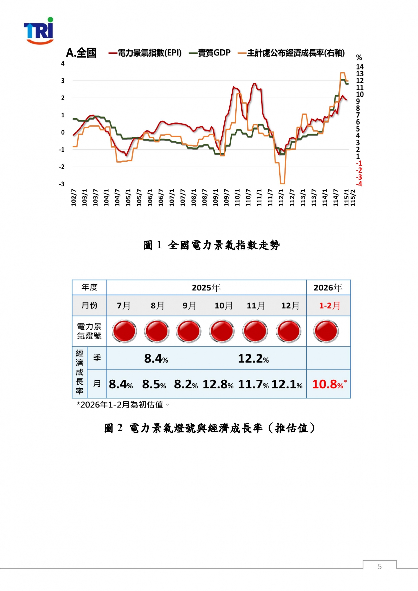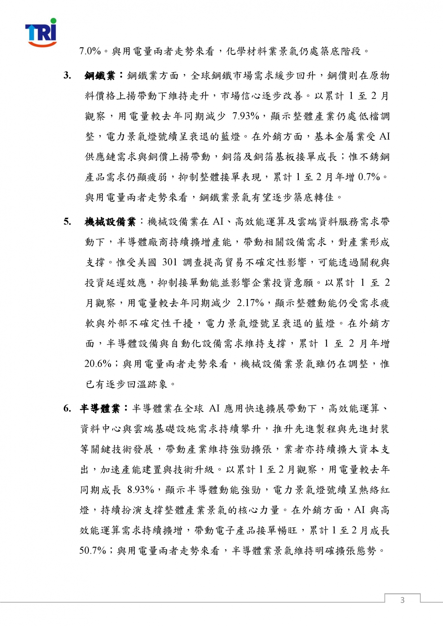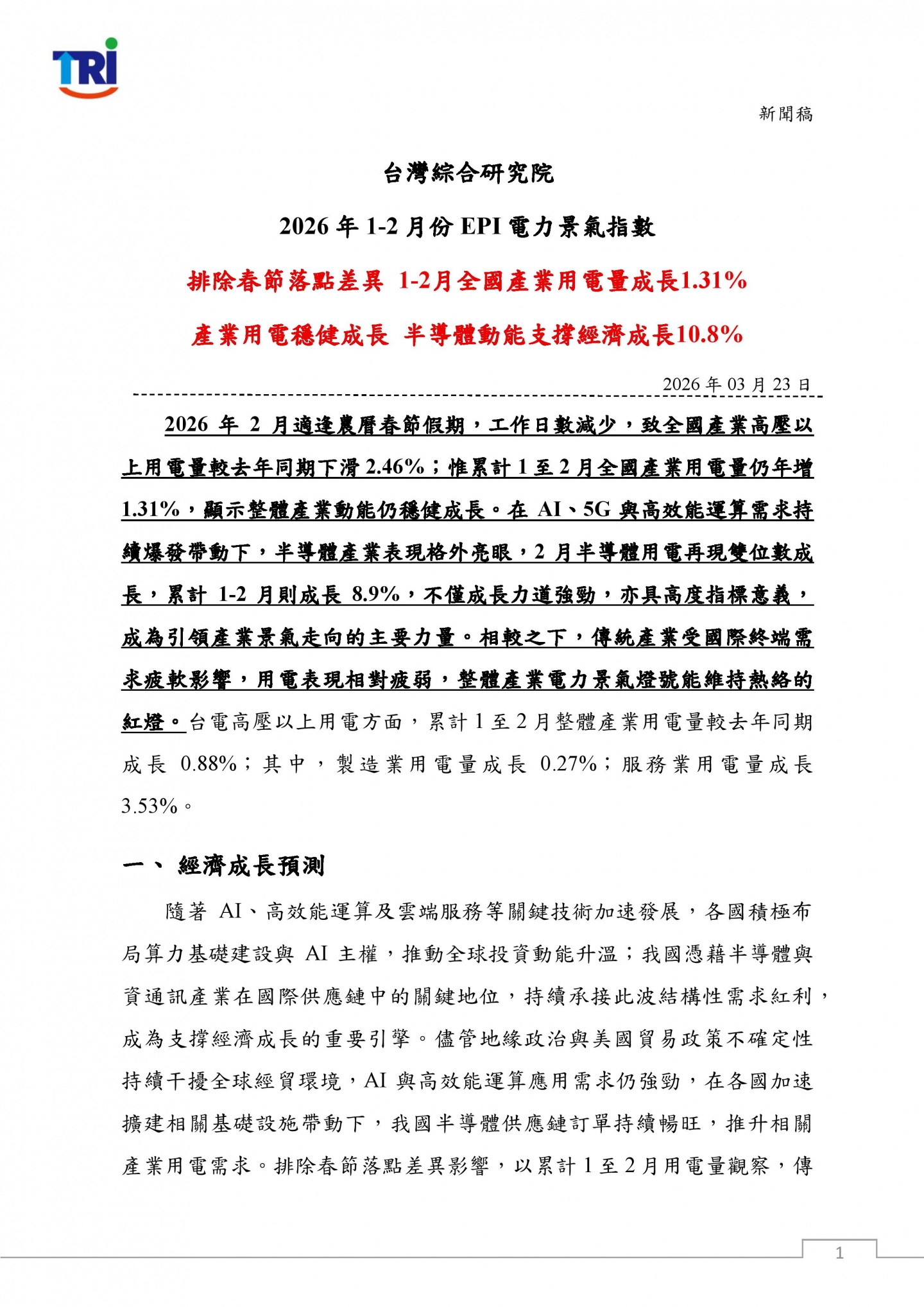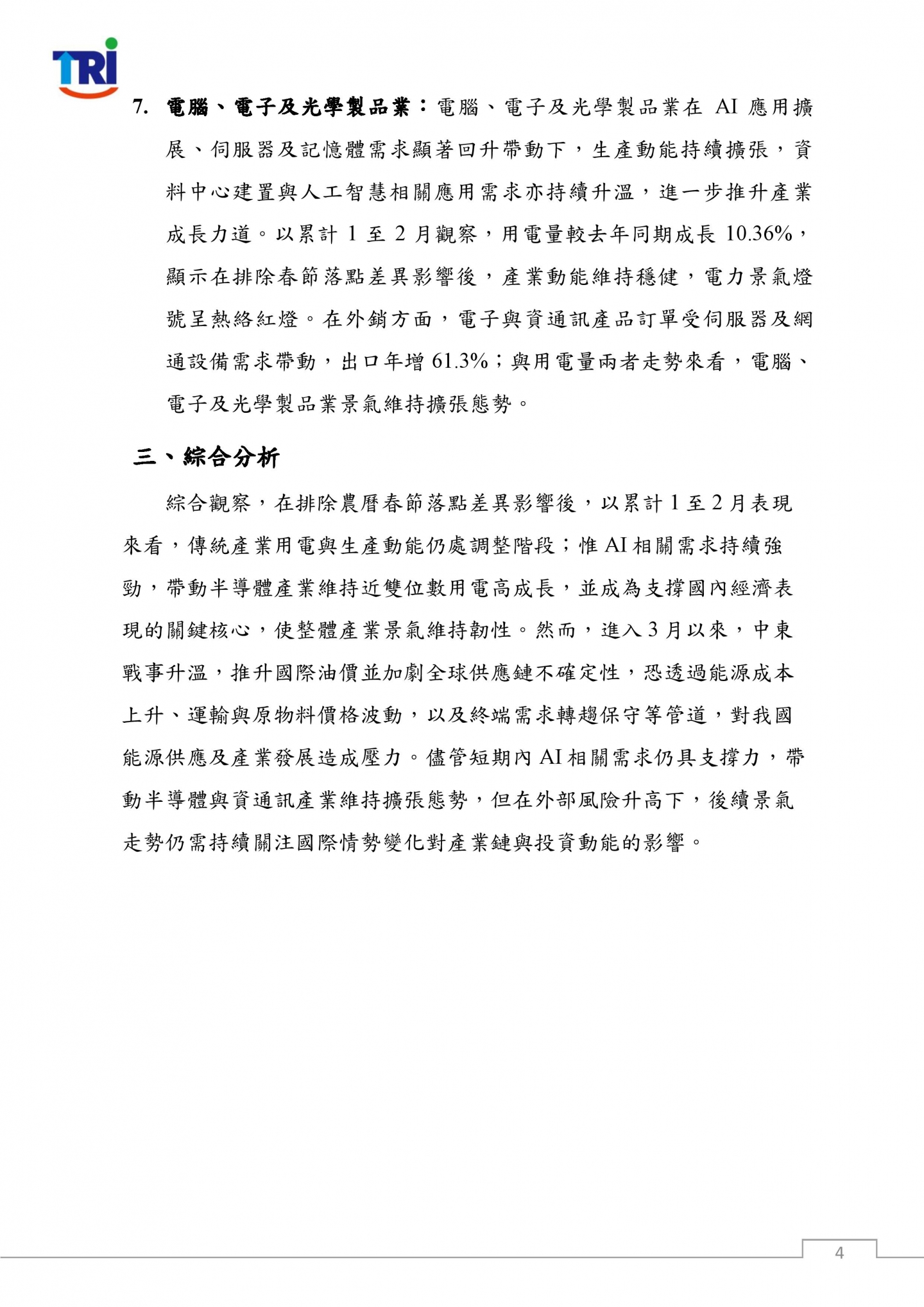 綜合觀察,在排除農曆春節落點差異影響後,以累計1至2月表現來看,傳統產業用電與生產動能仍處調整階段;惟AI相關需求持續強勁,帶動半導體產業維持近雙位數用電高成長,並成為支撐國內經濟表現的關鍵核心,使整體產業景氣維持韌性。然而,進入3月以來,中東戰事升溫,推升國際油價並加劇全球供應鏈不確定性,恐透過能源成本上升、運輸與原物料價格波動,以及終端需求轉趨保守等管道,對我國能源供應及產業發展造成壓力。儘管短期內AI相關需求仍具支撐力,帶動半導體與資通訊產業維持擴張態勢,但在外部風險升高下,後續景氣走勢仍需持續關注國際情勢變化對產業鏈與投資動能的影響。