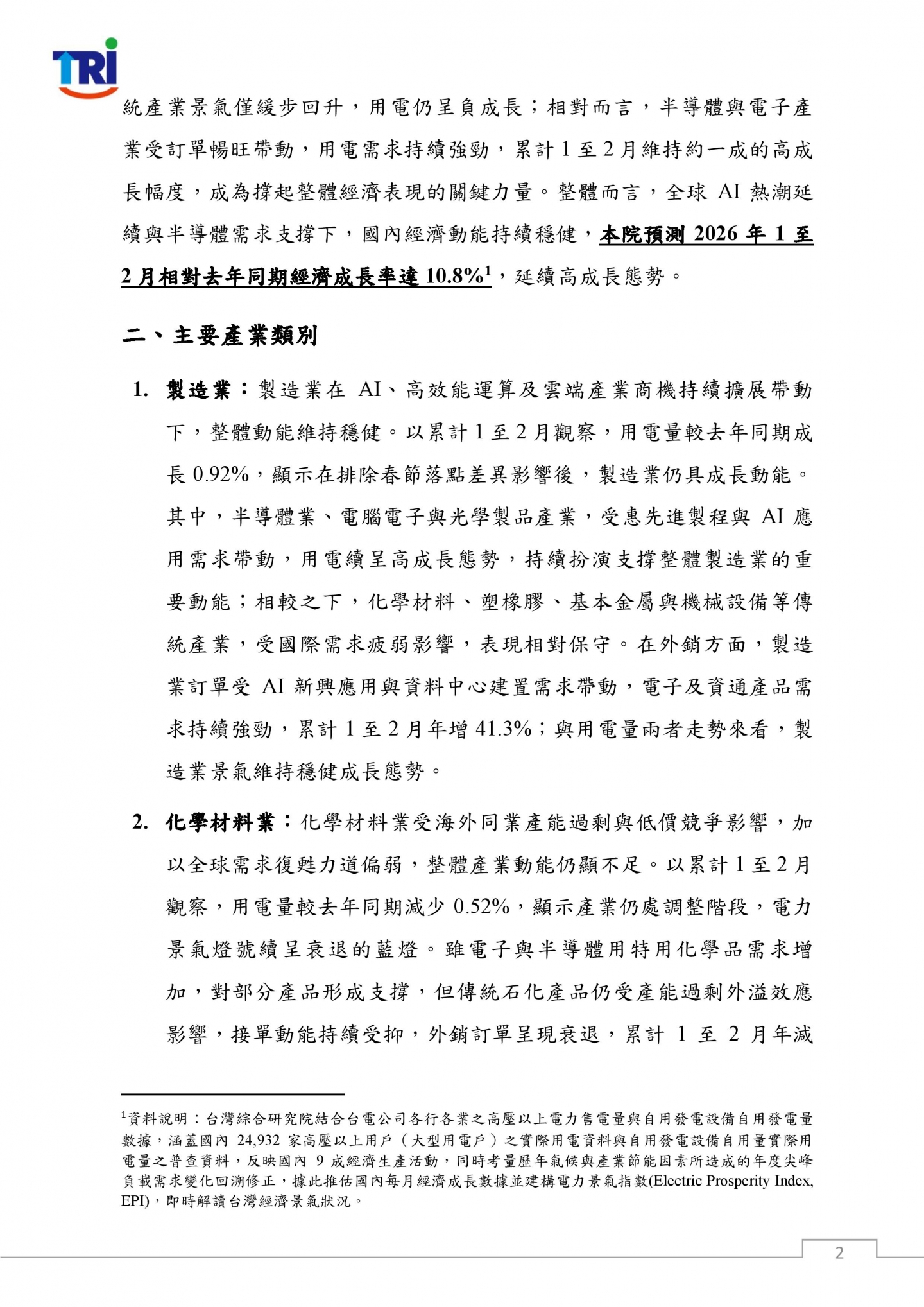隨著AI、高效能運算及雲端服務等關鍵技術加速發展,各國積極布局算力基礎建設與AI主權,推動全球投資動能升溫;我國憑藉半導體與資通訊產業在國際供應鏈中的關鍵地位,持續承接此波結構性需求紅利,成為支撐經濟成長的重要引擎。儘管地緣政治與美國貿易政策不確定性持續干擾全球經貿環境,AI與高效能運算應用需求仍強勁,在各國加速擴建相關基礎設施帶動下,我國半導體供應鏈訂單持續暢旺,推升相關產業用電需求。排除春節落點差異影響,以累計1至2月用電量觀察,傳統產業景氣僅緩步回升,用電仍呈負成長;相對而言,半導體與電子產業受訂單暢旺帶動,用電需求持續強勁,累計1至2月維持約一成的高成長幅度,成為撐起整體經濟表現的關鍵力量。整體而言,全球AI熱潮延續與半導體需求支撐下,國內經濟動能持續穩健,本院預測2026年1至2月相對去年同期經濟成長率達10.8%,延續高成長態勢。